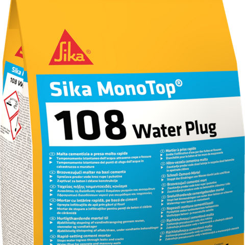Sika MonoTop®-108 Water Plug on kiirkõvenev, veekindel tsemendimört vee lekkekohtade sulgemiseks betoonis ja müüritises.